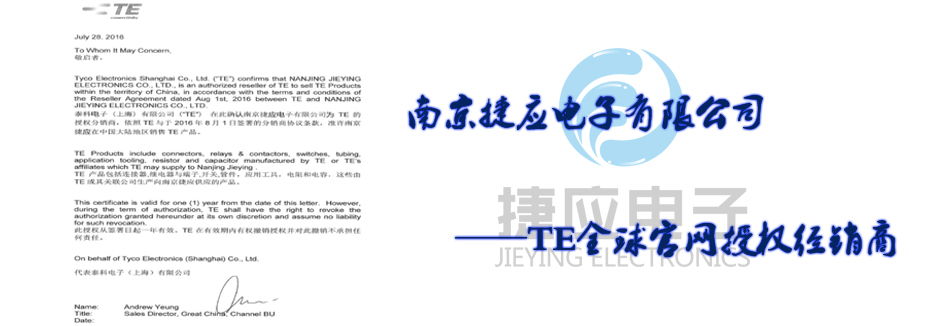 南京捷應電子有限公司是國際無源器件品牌美國泰科電子(TE)在中國華東地區(qū)的主要通路商,代理經銷旗下全系列產品包括TYCO(AMP)系列連接器、接插件、OEG、SCHRACK、P&B功率繼電器、美國RACHEM各類航空導線、熱縮套管、?s套、標識產品、電線電纜。